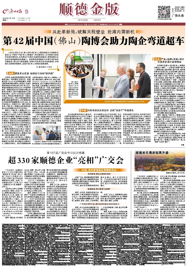 - 超330家顺德企业“亮相”广交会 广州日报讯 (全媒体记者黄子宁)作为中国外贸的“晴雨表”和“风向标”,第137届广交会于今日起至5月5日在广州举行,线上平台也将继续常态化运营。本届广交会参展企业约3.1万家,比上一届增加近900
