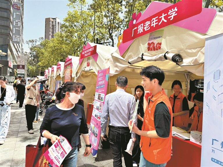 记者发现,在广报老年大学的摊位前簇拥着不少长者,他们在寻找自己喜爱的课程。广报老年大学自去年以来在全市11区开设了100个教学点,开设30多类课程,聘请超过30位专业老师,开课超过4000节,开课总时长超过4000小时,服务超过10万人次。