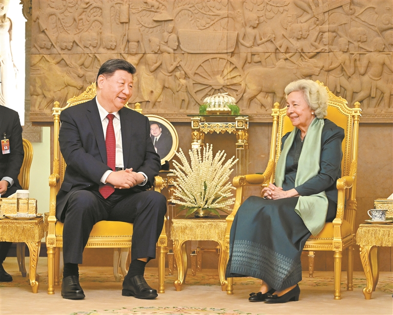 新华社金边4月17日电 (记者乔继红、孙楠)4月17日晚,国家主席习近平同柬埔寨太后莫尼列在金边王宫举行会见。