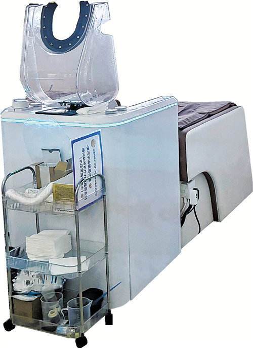 整个洗发流程比较简单,在洗发前工作人员先对机器进行“一键消毒”,并拿出一对耳塞,“可以戴上耳塞,洗发的时候声音比较大。”随后,工作人员协助记者躺在按摩椅上,并打开按摩椅开关,之后将记者头发放置在洗发盆内,罩上透明罩,按下开关便开始洗发。在体验过程中,记者感受到仪器内的水柱通过变换位置清洗头发,同时调节水流大小,仪器自动喷出洗发露和护发素。与传统理发店相比,洗发过程中没有“按头”(头部按摩、抓痒)步骤。洗完头发后,在店内右侧区域,有落地式吹风机供顾客使用。洗发流程约13分钟,吹发时间根据头发长短不定。