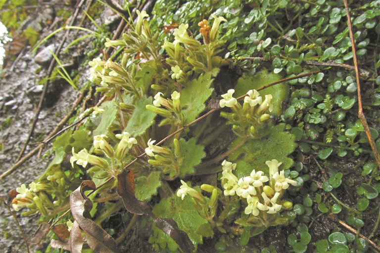 徒步行走在赤红色的丹霞山壁间,也许会发现岩缝中绽放着一朵朵精致小花。“素颜”的它犹如不食人间烟火的“仙子”,洁白的花瓣上暗生着一条条紫红纹路宛如天然刺绣,和普通野花相比气质独特。这就是苦苣苔家族的丹霞小花苣苔。