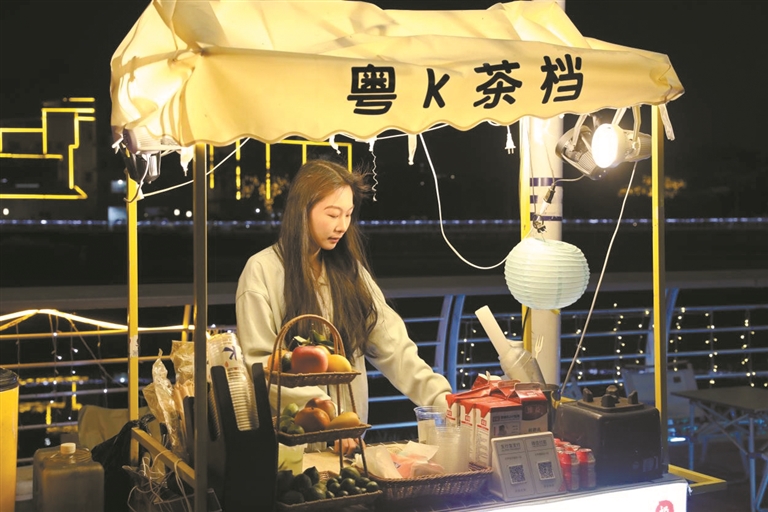 漫步凤凰花海碧道,旁边一个个特色小摊错落有致,不仅是一道亮丽风景线,更是年轻人创业梦想的孵化地。易小姐便是其中一位怀揣创业梦的摊主。她笑着说:“听朋友讲凤凰花海晚上人多,就带着自家小狗来这儿摆柠檬茶摊,试试运气。”事实证明,她的尝试十分成功。
