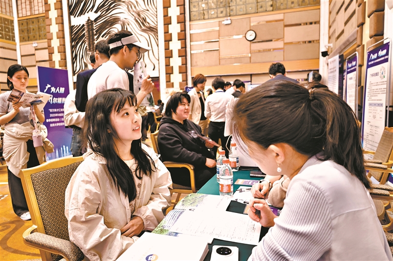 4月20日,“百万英才汇南粤”2025年N城联动春季招聘活动(北京站)18所知名高校招聘专场火热举行。广州各区和市直单位携国企、专精特新“小巨人”企业、产业链龙头企业各路“天团”,带岗位、带政策、带礼遇,向广大英才抛出“橄榄枝”,发出湾区“邀请函”。清华大学、北京大学、中国人民大学、北京邮电大学等18所高校的招聘会现场人潮涌动、气氛热烈,既有人向心仪公司投出多份简历,也有人当场签约实现跨越南北的“双向奔赴”;既有人青睐广州“智能制造”岗,也有人“垂涎”广州的美食和气候。