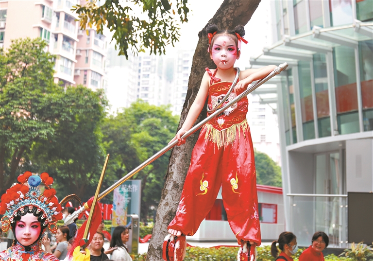 巡游方阵阵容强大,亮点纷呈。既有“八仙祝寿”方阵,也有少年龙狮队,还有非遗飘色方阵等。非遗飘色方阵为今年新增的巡游方阵。3—5岁的儿童身着精致的古装戏服,小手稳稳握住长矛、刀剑,仿佛会轻功一般,轻盈地悬于半空。他们灵动地穿梭于历史悠久的祠堂与摩登时尚的楼宇之间,所到之处,欢呼声、叫好声此起彼伏。“哪吒伏魔”这一组飘色更是十分“抢眼”。