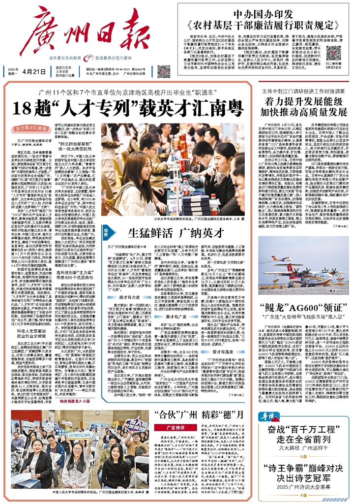 - “合伙”广州 精彩“穗”月 广言快评 菁英汇南粤,广州约定你! 雨润百谷,万物逢时。一场跨越南北的“人才之约”吹响了青年英才“集结号”——“百万英才汇南粤”2025年N城联动春季招聘活动(北京站)创新采用“1+1+N
