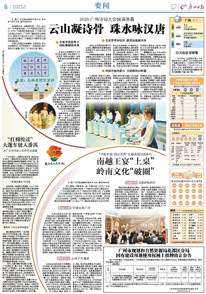 - 云山凝诗骨 珠水咏汉唐 文、图/广州日报全媒体记者吴波、黄岚 实习生吴芷柔 通讯员穗阅宣 岭南春色浓,诗意满花城。近日,由中共广州市委宣传部、广州市新闻出版局主办,中共广州荔湾区委宣传部、广州新华发行有限公司协办,广
