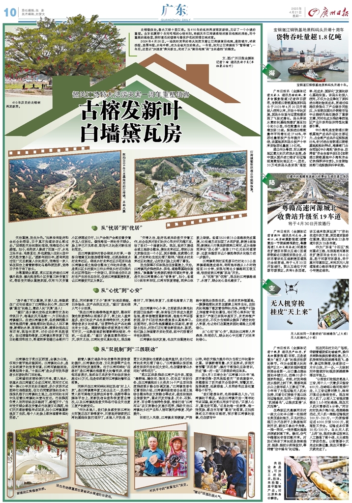 - 古榕发新叶 白墙黛瓦房 古榕垂荫处,春水又绿十里江湾。当410年的虬枝再度萌发新绿,见证了一个小镇的重塑。去岁初夏那个山河呜咽的心碎时刻,将韶关市江湾镇揉碎成满目疮痍的残卷,而今重展的画卷里,钢钎凿石的铿锵与春泥护花的深