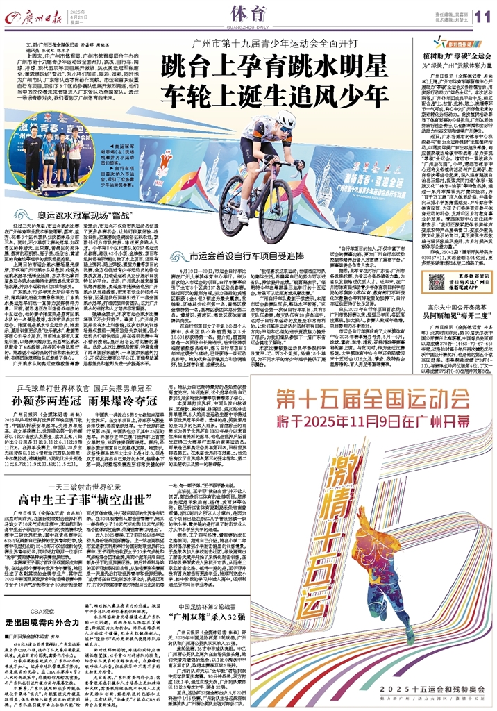 - 跳台上孕育跳水明星 车轮上诞生追风少年 文、图/广州日报全媒体记者 孙嘉晖 周婉琪 通讯员 张健虹 陈宋华 上周末,由广州市体育局、广州市教育局联合主办的广州市第十九届青少年运动会全面开打,跳水、自行车、网球、排球、现代五项等项