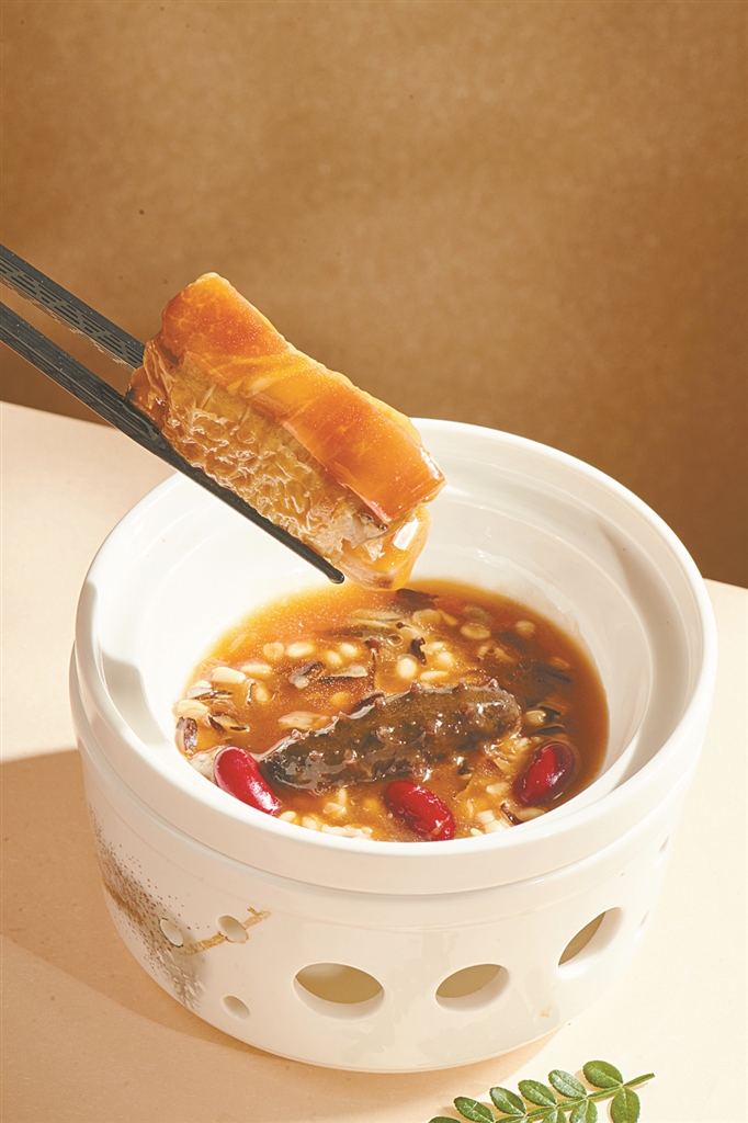 到奉点心“明珠缀彩”的灵感源自海珠区“宝珠化礁”的传说,师傅将冬瓜制成宝珠状,宛如明珠出水,寓意“明珠缀彩,福至客来”,“宝珠”入口酸甜,配上牛奶小番茄,在清新间启动味蕾。珍鲜炖汤“双塔竞秀”则以守护珠江航道,见证广州海上贸易繁华的琶洲塔、赤岗塔为创意原点,将铁棍淮山与百合层叠如塔,搭配宝塔菜,在高汤浸润间,鲜味逐浪而来。“棉花鸡扎”是一道经典点心,厨师精选肉质丰腴的鸡腿肉,佐以浮皮、花菇以古法扎制,浇上秘制鲍鱼汁,配以海参盏底铺陈红腰豆、燕麦、野米,既承“一盅两件”的饮茶古韵亦暗合海珠商埠“以食稳商、舟车通达”的千年智慧。