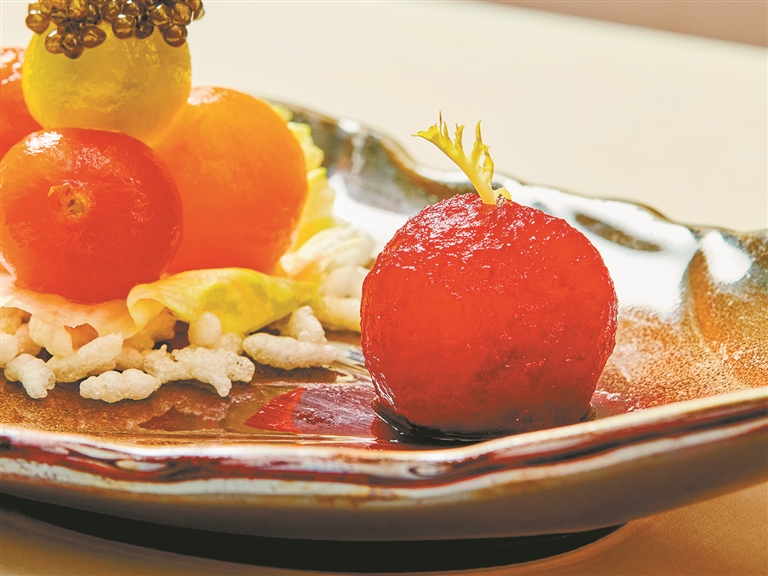 金酥玉脍是甄选主点,这是一道手作酥挞。相传18世纪海珠商贾冠全球,潘氏珍馐宴乐动五洲承其宴客之诚,便手作酥挞献珍肴。此次的酥挞,由师傅全手工开酥,以揉、搓、铺、擀、叠等多道工序制成“空气感”十足的酥皮,三文鱼叠青瓜、西芹,点缀蟹籽佐以奶酪组成挞芯,鲜香层层递进。