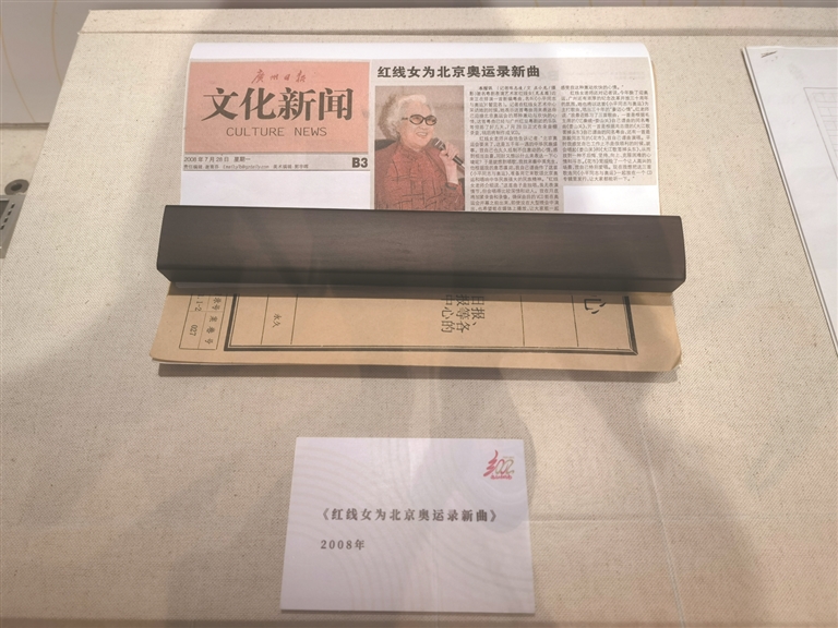 记者在展柜中看到了一份2008年7月28日的《广州日报》文化新闻,刊登的文章《红线女为北京奥运录新曲》中,当时红线女接受本报采访时表示,希望通过新编的粤曲来表达自己迎接北京奥运会的激动心情。