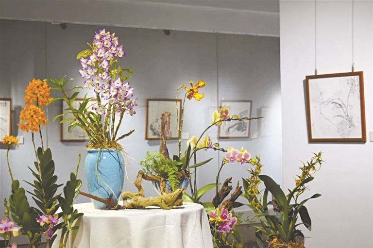 展览现场,高剑父纪念馆创新融合书画艺术与园林美学打造多处兰花小景,营造“游园赏兰”的观展体验。造景或将兰花置于仿古木架之上,或点缀于假山奇石之间,与悬挂的兰花画作遥相呼应。