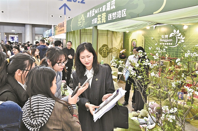 在“百万英才汇南粤”杭州场,以“东莞大道”命名的沉浸式主题展区成为焦点。这条长约120米的东莞大道特展区,寓意广东到杭州的1200公里距离,以“看得见的精彩都市”的主题讲述了粤浙一家亲、杭莞双城的发展故事,吸引了长三角高层次人才驻足交流。此外,东莞企业徐福记向求职者赠送公司的经典零食产品——酥心糖礼盒,将“特别的甜给特别你”,传递城市温度与企业社会责任。现场年轻人排起了长长的队伍“领甜蜜”,来自东莞的这份“甜蜜”让年轻人充分感受到东莞的包容与热情。