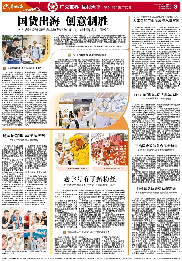 - 老字号有了新粉丝 文/广州日报全媒体记者许晓芳、谭伟婷 图/广州日报全媒体记者吴子良、王燕、杨耀烨 千里江山图、舞狮表演互动、南越王情景剧……广东省各老字号企业联袂走进第137届广交会第二期,深度探索了一条