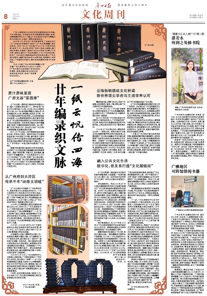 - 廿年编录织文脉 一纸云帆传四海 广州,这座拥有2200多年历史的国家首批文化名城,千年文脉兴盛。所有的历史印记都需要通过遗迹、地名、文献等载体来为今人了解。《广州大典》作为地方文献集大成之大型丛书,正是这一载体的绝佳形式。