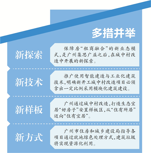 保障房“租商融合”的新业态模式,是广州集思广益之后,在城中村改造中开展的新探索。广州市住房和城乡建设局鼓励引导村民和村集体,利用富余安置房建设保障性租赁住房,将原有户型拆分为42.5平方米、28.3平方米的实用性户型,降低租金总价,引入企业进行整租运营,结合底商裙楼完善社区配套,打造具有市场竞争力、可持续发展的“租住+商业+市场化运作”新业态模式。同时,通过“刚性任务+灵活抵扣”的保障性住房任务,激发属地区政府的积极性。