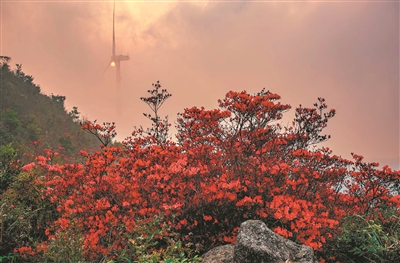 风电场所处群山生态优良,草丰林茂,风光奇丽,有高山草甸、原生灌木林、水源林。每年春末夏初的四五月份,山上一株株、一丛丛野生杜鹃花便竞相绽放,姹紫嫣红,与一座座矗立云霄的风电场“大风车”相映成趣,勾勒出一幅现代科技融入自然生态特有的壮美景观,呈现一幅会“转动”的唯美画卷。此时,群山远远望去就像披上了一张鲜艳的红绸缎,红波起伏,蔚为壮观,形成美不胜收、动静相宜的高山画卷;而人入“画”中,心扉愉悦,心获疗愈。