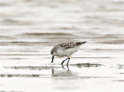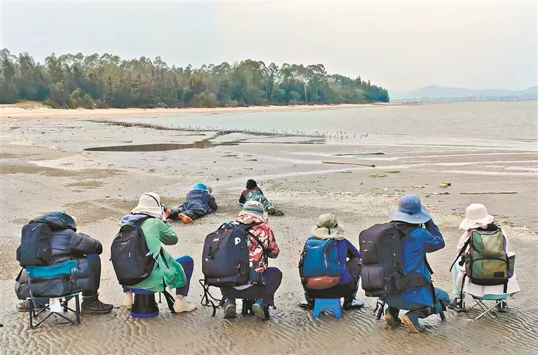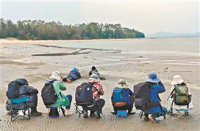 常驻广州的观鸟爱好者们在其他城市留下了很多有趣的“追鸟”记忆。2023年4月,小刘和鸟友一起去阳西找飞来越冬的勺嘴鹬。这种鸟类是国家一级保护野生动物,是全球最濒危的鸟类之一。退潮后,沿海的滩涂面积很大,成千上万只小鸟在滩涂上觅食。勺嘴鹬的个头很小,外观并不起眼,要找到它们并不容易,“需要根据它的动作从成群的鸟中识别出来”。他们十几个人顶着海边的大风,拿着望远镜,沿着滩涂一点点耐心寻找,最后有一个鸟友成功发现了一只正在用嘴突突地左右扫动、专心觅食的勺嘴鹬,于是打手势叫他们过去。一群人在离鸟几十米的地方,尽量不动,安静地观察、拍摄。