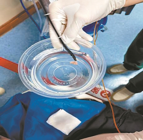 该院急诊科抢救团队早已严阵以待,上胸外按压机,气管插管接呼吸机,纤支镜检查,吸出气道内异物(直径约1厘米肉末),间隔3分钟肾上腺素1mg推注,多巴胺、去甲肾上腺素、碳酸氢钠注射液……医嘱不断下达和执行,患者心电活动时有时无,并出现持续室颤,除颤仪一次又一次放电除颤,在这场持续一小时的抢救中,医护人员用了二十多支肾上腺素,他们凭借着专业的技术和顽强的毅力,不放弃任何一丝希望。幸运的是,患者恢复了自主心率,随后被送往ICU做进一步治疗。