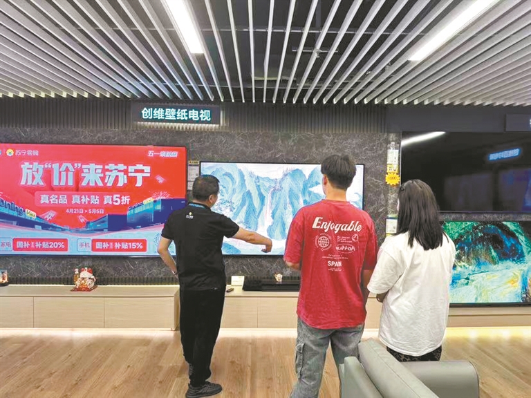 根据广州市目前的“以旧换新”政策,一级能效的电视选择10000元左右最划算,能够享受最高2000元的补贴。“五一”假期是换新电视的好时机,因为选择更加丰富了,其中还有不少新品。某线下家电卖场里就有超30款电视新品首发,比如提供院线级影音体验的百英寸巨幕电视,将电视如壁画般融入墙面、提升家居品位的壁纸电视,如同一位“好看的帮手”,可以修复老照片、定制旅游攻略的治愈系AI电视等,都是换新的热门产品。苏宁易购数据显示,2025年一季度,85英寸及以上大屏彩电销售占比已超五成,AI交互功能成为核心需求。结合相关“以旧换新”政策,电视可享15%~20%的换新补贴,单件商品至高补贴2000元。目前,AI智能电视的高端产品普遍在万元级别,可享最高2000元补贴。
