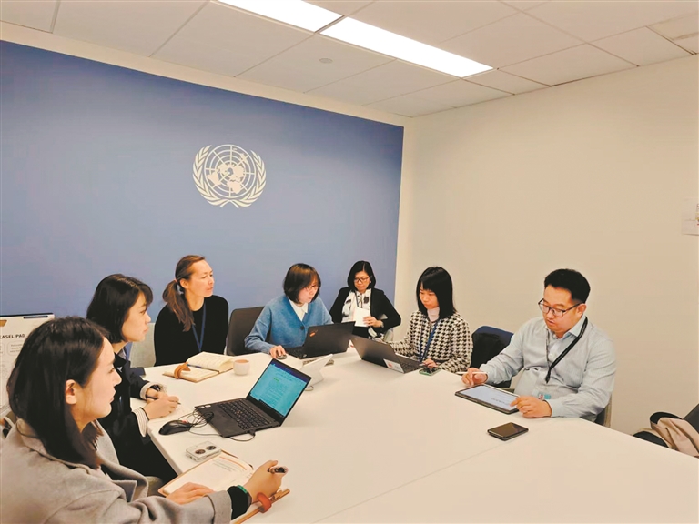 在联合国总部,陈斐媛(右二)与团队成员研讨。