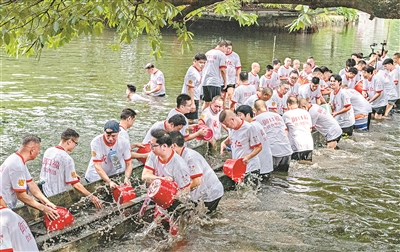 起龙船的过程少不了艰辛,大家跳入淤泥中,一起喊口号:“起啊!起啊!”船露于水面后,还要清洗干净,再从挖开的口子送出二沙涌,大家都干劲十足。有的家长还带来了年轻一辈的小伙子来参与,让他们亲身感受传统文化。