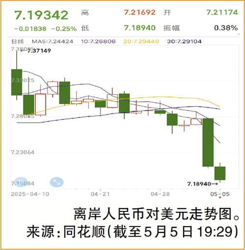 记者留意到,“五一”期间,离岸人民币对美元汇率持续大幅上涨,5月2日单日涨幅超过600个基点,盘中一度涨破7.21关口;5月5日,离岸人民币对美元汇率延续涨势,盘中陆续升破7.20、7.19关口,触及7.18940,日内涨逾130个基点。