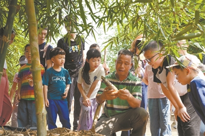 5月2日至3日,林岳吊丝丹竹笋美食文化节系列活动——亲子研学游活动举行,30组亲子家庭走进林岳吊丝丹竹笋种植基地,沉浸式体验竹笋挖掘,品尝特色笋宴。活动中,林岳吊丝丹竹笋推广大使麦钻玮还为孩子们讲解林岳吊丝丹竹笋的名字来由和独特之处,让更多人了解背后的文化内涵。“我很爱吃竹笋,以前妈妈带我吃过林岳吊丝丹竹笋,这次是我亲手挖竹笋,感觉自己挖过后,竹笋更好吃了。”来自广州的小罗同学说。