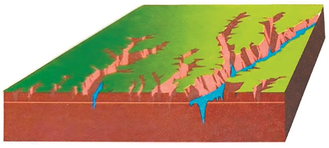 青年早期(高原峡谷型景观):红层抬升期,高原峡谷地貌组合。属地壳抬升-流水下切-巷谷、峡谷发育阶段,多呈现瀑布、跌水景观。(上图)