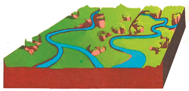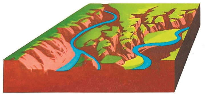 壮年早期(密集峰丛型景观):山块离散,主河谷峡谷-宽谷相间分布,近河谷多峰林,远河谷多峰丛,地表最崎岖。