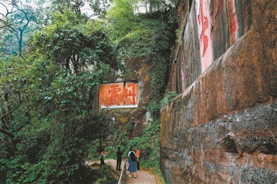 离船上岸,从赤壁丹崖的山脚向上登攀至长老峰,是游人来丹霞山必打卡的项目。时值初夏,岭南气候湿润,记者来到山腰的锦石岩寺,潺潺的水声传入耳中。站在亭中,仔细搜索,记者看到一条美丽的瀑布从山崖上悬挂而下,流水直落上百米,犹如一匹骏马的尾巴,马尾瀑布因此得名。