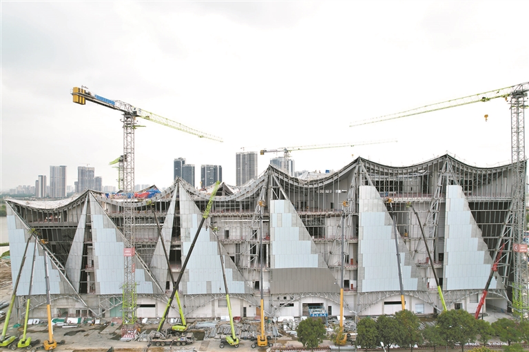 广州日报讯 (全媒体记者耿旭静、董业衡 通讯员王千瑞摄影报道)在广州大湾区科学论坛永久会址项目建设现场,学术中心和科技馆施工繁忙,建设者们忙于幕墙工程、金属屋面、机电安装、精装修施工,以实际行动推动项目建设跑出“加速度”,冲刺年内建成目标。