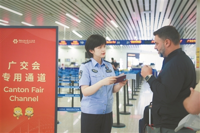 经过简单交流,于童得知两位旅客首次来华因通关流程犯了难。于童将他们指引至入境卡填写处,耐心地指导他们填写详细信息,随后将他们带到广交会专用通道候检。旅客竖起大拇指,对于童暖心的外语指引服务点赞。