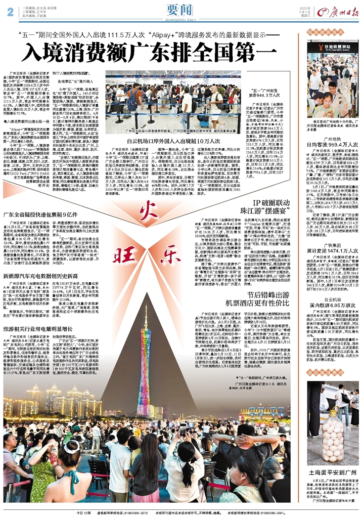 - 入境消费额广东排全国第一 广州日报讯 (全媒体记者罗磊)国家移民管理局日前发布数据,今年“五一”假期期间,全国边检机关共保障1089.6万人次中外人员出入境,日均217.9万人次,较去年“五一”假期期间增长28.7%。其中