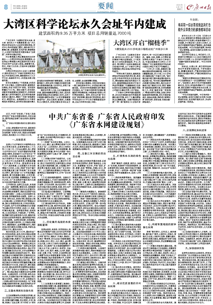 - 中共广东省委 广东省人民政府印发 《广东省水网建设规划》 近日,中共广东省委、广东省人民政府印发《广东省水网建设规划》,并发出通知,要求各地区各部门结合实际认真贯彻落实。 《广东省水网建设规划》主要内容如下。 为深入贯彻落实中共中央、国务院印发的