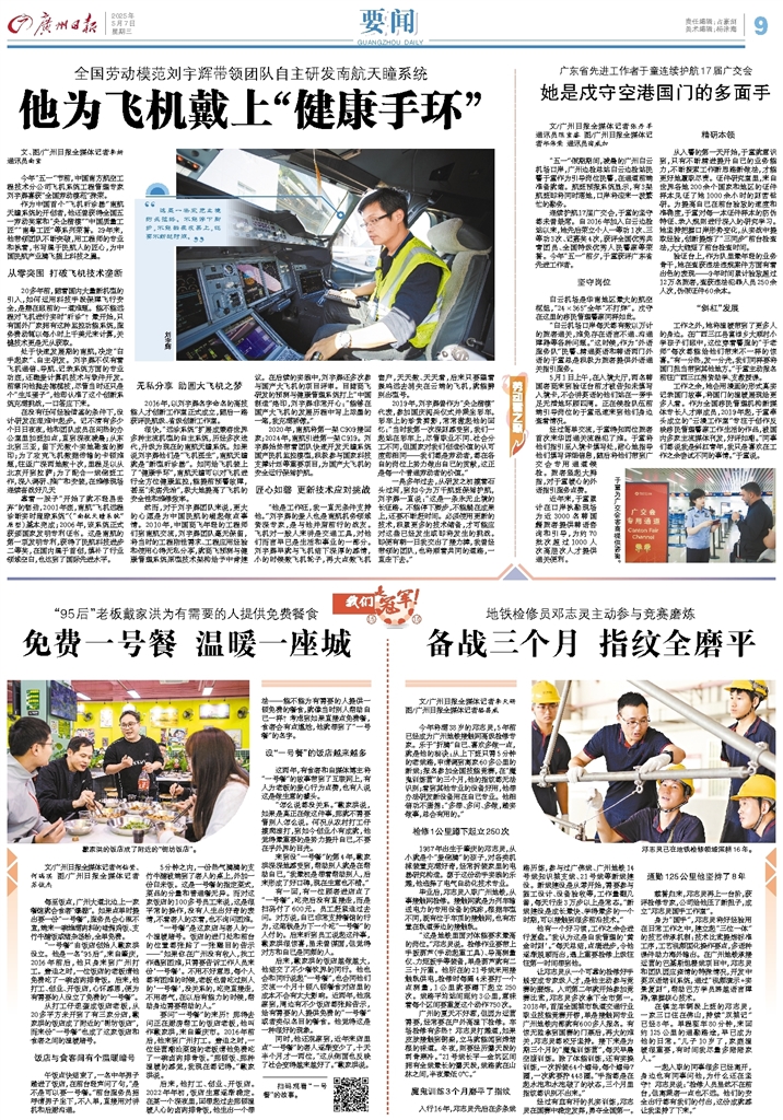 - 他为飞机戴上“健康手环” 劳动者之歌 “这是一条永无止境的长征路。不能停下脚步,不能躺在成果上,还要不断赶时间。” 文、图/广州日报全媒体记者李妍 通讯员南宣 今年“五一”节前,中国南方航空工程技术分公司飞机系