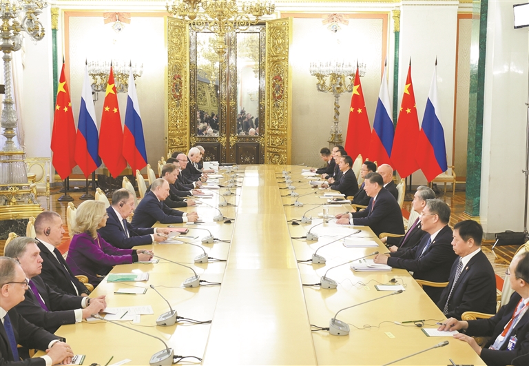 习近平指出,近年来,在双方共同努力下,中俄关系保持稳定、健康、高水平发展态势,长期睦邻友好、互利合作共赢成为两国关系的鲜明特征。两国政治互信根基越扎越深,务实合作纽带越系越牢,人文交流和地方交往越来越红火,新时代的中俄关系更加从容自信、稳定坚韧。历史和现实充分证明,持续发展和深化中俄关系,是传承两国人民世代友好的应有之义,是双方彼此成就、促进各自发展振兴的必然选择,也是捍卫国际公平正义、推进全球治理体系改革的时代呼唤。