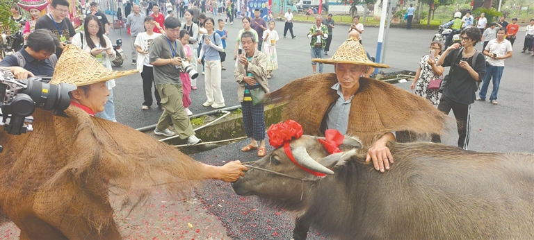 壮族“牛王诞”传承370余年,2015年被列入省级非遗名录。相传,壮族先民驯化野牛后,于某年四月初八迎来公牛犊,它改变了人力耕作的艰辛,自此被尊为牛王“始祖”。