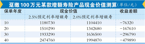 预定利率下调,受影响的不仅仅是重疾险,增额寿险、年金险等长期储蓄险的收益也会受到影响。记者调查发现,近年来市场上热销的增额寿险的现金价值增长,就与预定利率直接挂钩。以某增额寿险产品为例,同一位被保险人趸缴100万元,若预定利率从2.5%降至2.0%,保单持有10年,现金价值减少了7万多元,20年时减少超16万元,40年时收益减少了将近48万元,投资者的收益下降了。多位券商分析师认为,预定利率进一步下调后,传统险产品竞争力下降难以避免,分红险销售能力更为凸显。