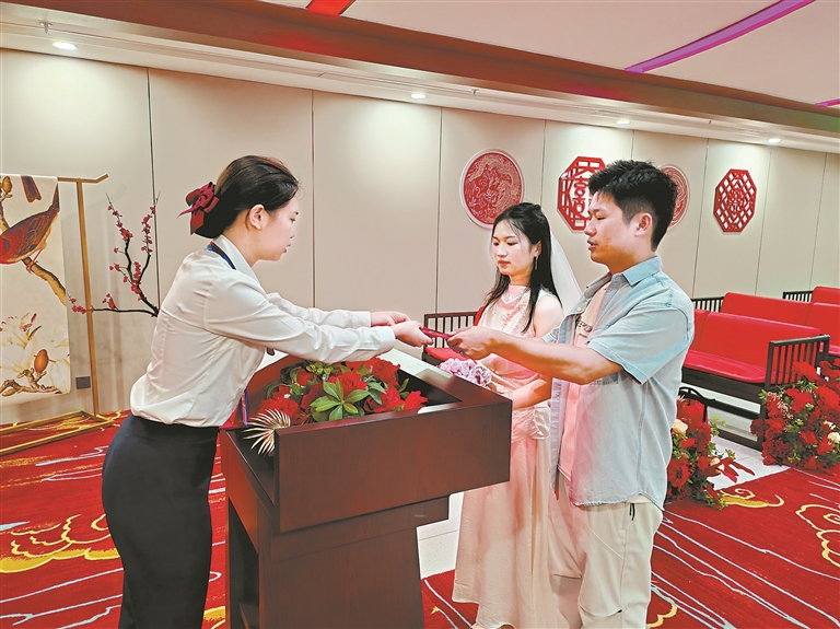 由于新修订的《婚姻登记条例》大大简化了结婚登记方面的材料要求,当天上午,黄埔区民政局婚姻登记处登记量增长了55%。黄埔区民政局表示,此前已预计新修订的《婚姻登记条例》会带来登记量增长,未来将进一步配齐配强婚姻登记员队伍。