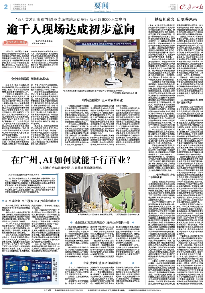 - 在广州,AI如何赋能千行百业? 文/广州日报全媒体记者何钻莹、陈钧圣 在广州这片创新热土上,人工智能的触角正悄然延伸。在天河区,AI赋能之下,广告创意能一键生成,助力海外游戏平台实现高质量的流量变现;在海珠区,大模型点燃