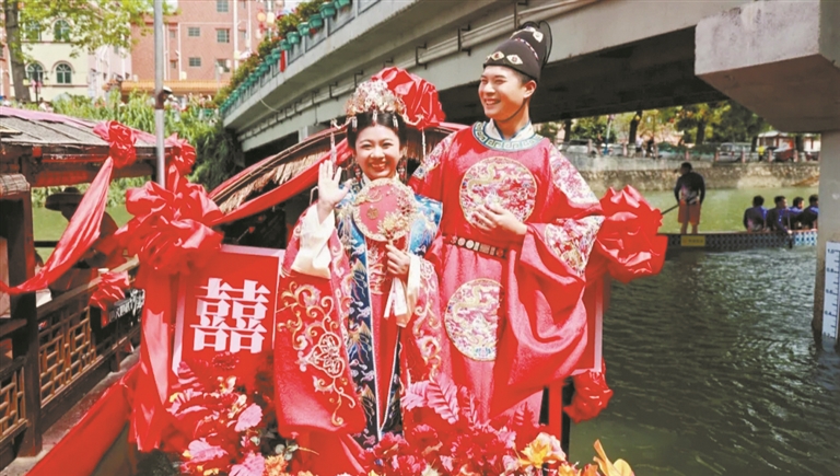 经过多轮考验,6对新人陆续登船开始幸福大巡游,先后经过粤韵桥、虹桥,最后来到迎亲平台,沿途接受亲朋好友和两岸群众的祝福,亲身感受“百年修得同船渡,千年修得共枕眠”的美好寓意。一条条古色古香的摇橹船,在潺潺流水间摇曳而来。新人们在众人的祝福声中,一路摇向属于自己的幸福甜蜜。