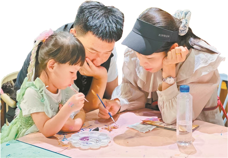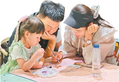 在正佳自然科学探索中心的非遗手作区,母女们合作制作螺钿饰品和古法药香香囊。市民林女士展示着刚做好的香囊:“亲手做的比买的好多啦!妈妈说这是她收到过最有‘手心温度’的礼物。”