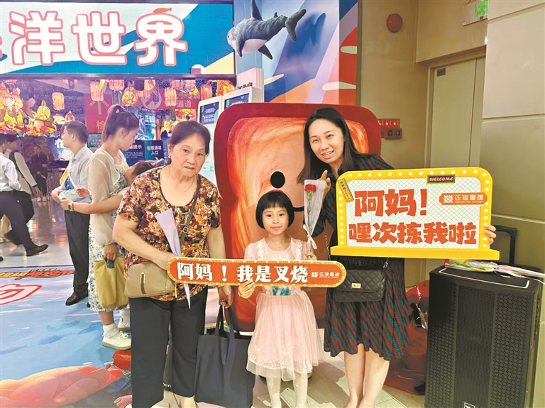 广东人熟悉的“生块叉烧好过生你”成了今年的热梗。来到正佳广场,一个巨型叉烧人偶也成为热门“打卡点”,而且它在现身的同时也给妈妈们送上了节日花束。市民张阿姨接过人偶递上的花束时笑得合不拢嘴:“没想到商场还能玩出新花样!”此外,不少在万菱汇参加活动的市民纷纷晒出了自己领到的“叉烧证”和明信片。“我感觉这个活动有趣还很有意义,也提醒我要多关心即将到更年期的妈妈。”大学生莫莫现场就跟还在外地出差的妈妈发了红包并打去电话,“阿妈,生块叉烧绝对不如生我好!”