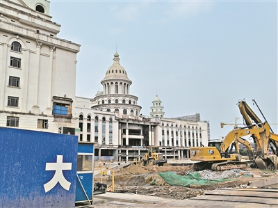 驱车自北向南驶过洛溪大桥,左前方白色的圆顶穹顶建筑跃入视野,这正是容屿项目所在。驶至近前,数台挖掘机正挥舞巨臂,拆旧建新。