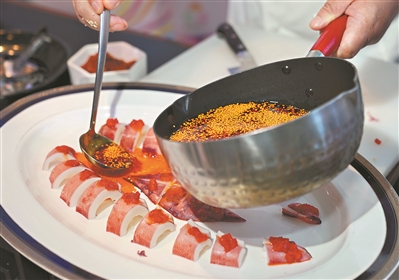 广州大厨先将深海鱿鱼洗净后,运用刀纹手法精心切片雕琢,摆盘呈现出火箭般造型备用,重庆大厨则将姜片、蒜子、花椒油、白芝麻等多种调料混合在一起制作成香辣红油,浇淋在摆好盘的火箭鱿鱼身上……在两地大厨的通力合作下,一道融合穗渝美食特色的佳肴新鲜出炉。