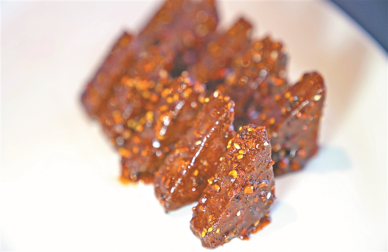 “迎五湖四海宾客,调穗心所渝美味。”刘波平带着“陈皮怪味牛肉方”这道融合川粤风味的创新菜品亮相活动。大厨用精湛刀工将雪花牛小排切成大小均一的三角形牛肉块,下热锅后炸至表面酥脆时捞出,再放入精心调制的怪味汁中翻炒浸润,最后用辣椒面与陈皮粒将牛肉块翻拌均匀后出锅摆盘。油润红亮的牛肉块与包裹着的金黄陈皮粒相融合,形成极强的视觉冲击力,散发出诱人的扑鼻香味。