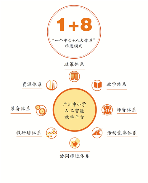 在布局人工智能教育的过程中,广州探索试点实验、政学研企横向联动、市区校三级纵向推进,提出“1+8”即“一个平台+八大体系”推进模式——广州通过搭建“广州中小学人工智能教学平台”,从政策、资源、教学、装备、师资、教研培、活动竞赛及协同推进等方面,统筹开展人工智能教育,利用信息技术手段实现人工智能教育覆盖农村地区。截至2024年,1519所学校全面铺开人工智能通识课程,广州构建起覆盖201万学子的人工智能教育网络,统筹推进人工智能教育普及落地见效。