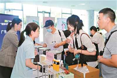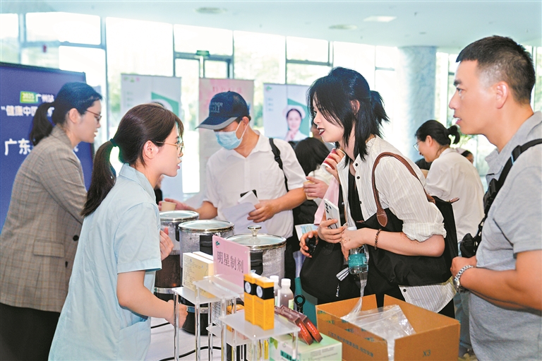 广东省中医院体重管理中心内分泌代谢科、治未病中心、针灸科、脾胃科、妇科乳腺科的多学科医护人员带着德叔团队研制推出的三款当季养生茶饮来到广州报业文化中心,引来大家大排长龙试饮和请专家把脉。“健脾祛湿轻身饮”适合暑湿天气偏胖、头身困重人群饮用,升级版的“抗视疲劳饮”和“清心除烦助眠饮”对办公室人群更是十分友好,“味道甘甜适口,好喝!”现场试饮的黄小姐说。