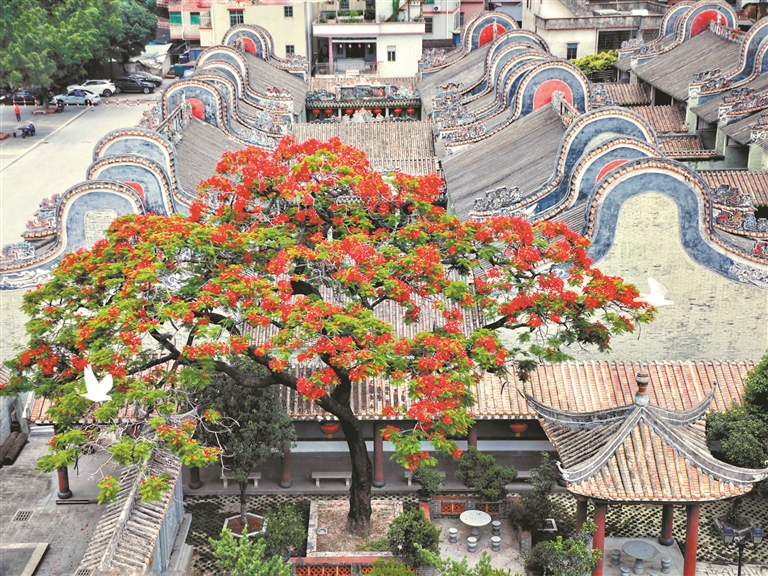 5月13日,记者实地探访看到,白云区龙归街南村村周氏大宗祠(孖祠堂)旁的凤凰木已花开过半。当地村民表示,预计再过一周,该凤凰木便可花开满枝头。本月,南村村的荷花也将进入盛花期,届时,游客来到这里便可同时欣赏凤凰花和荷花。